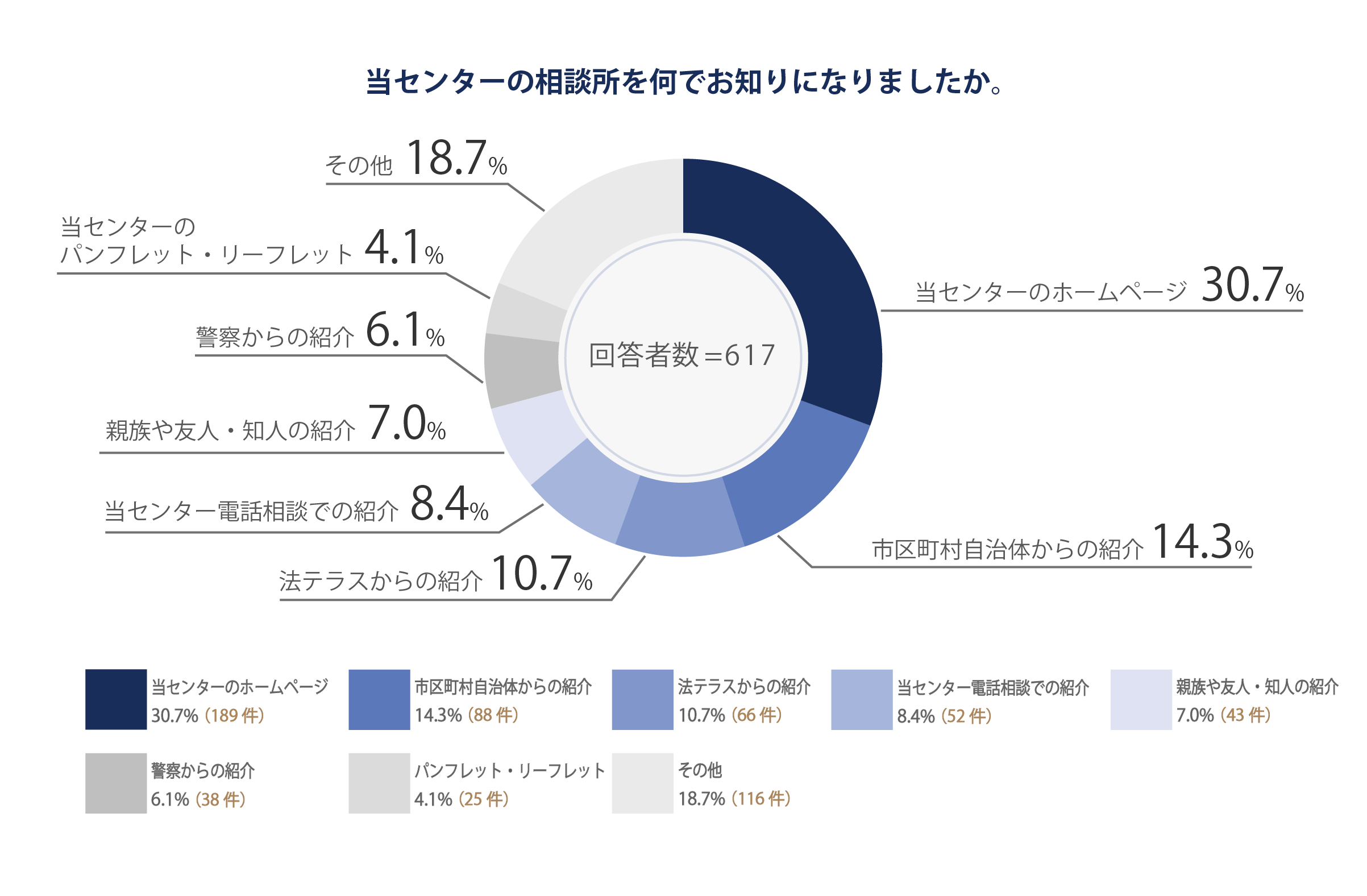 当センターは、相談者の約4割(38%)の方が警察や市区町村、法テラス、親族や友人・知人からの紹介を受けて相談されています(令和6年度実施アンケートより)。