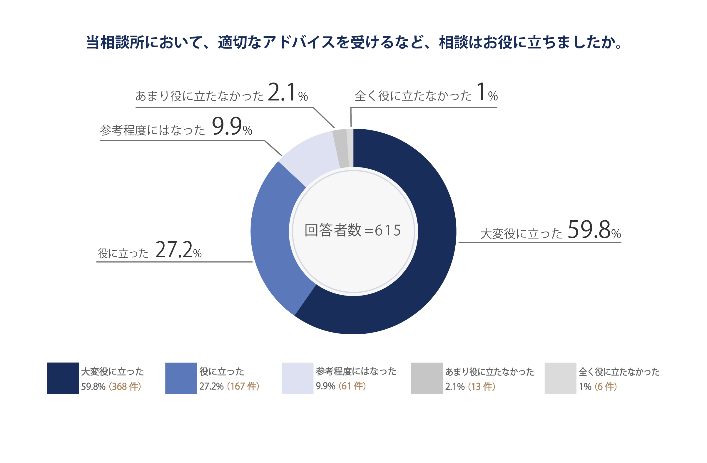 相談者の87%の方が「大変役に立った」もしくは「役に立った」と回答されています(令和6年度実施アンケートより)。